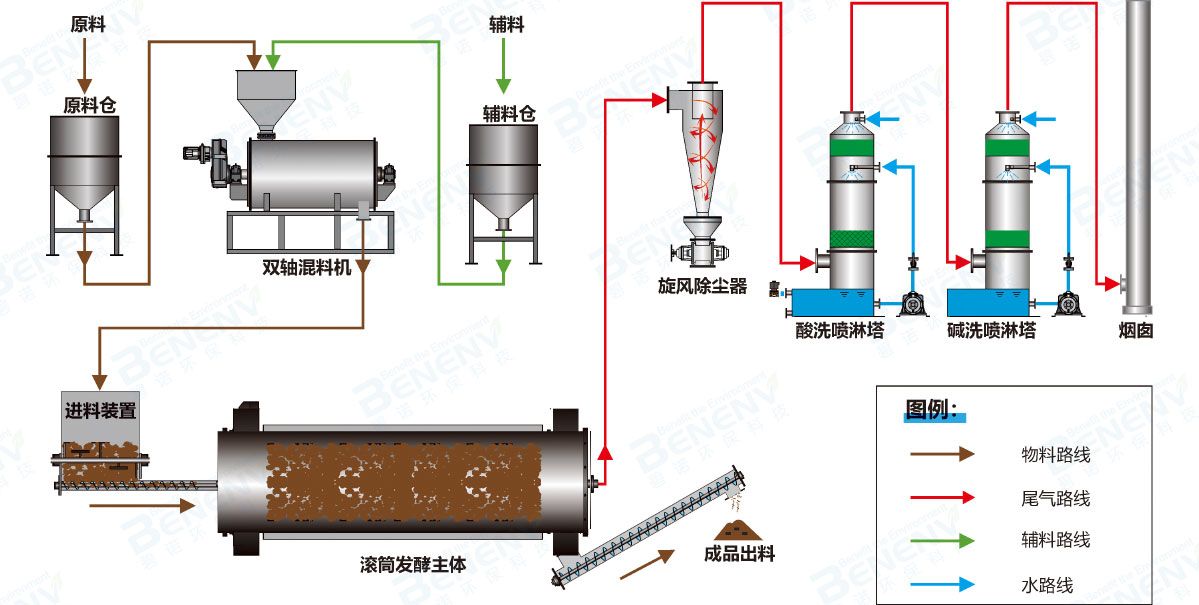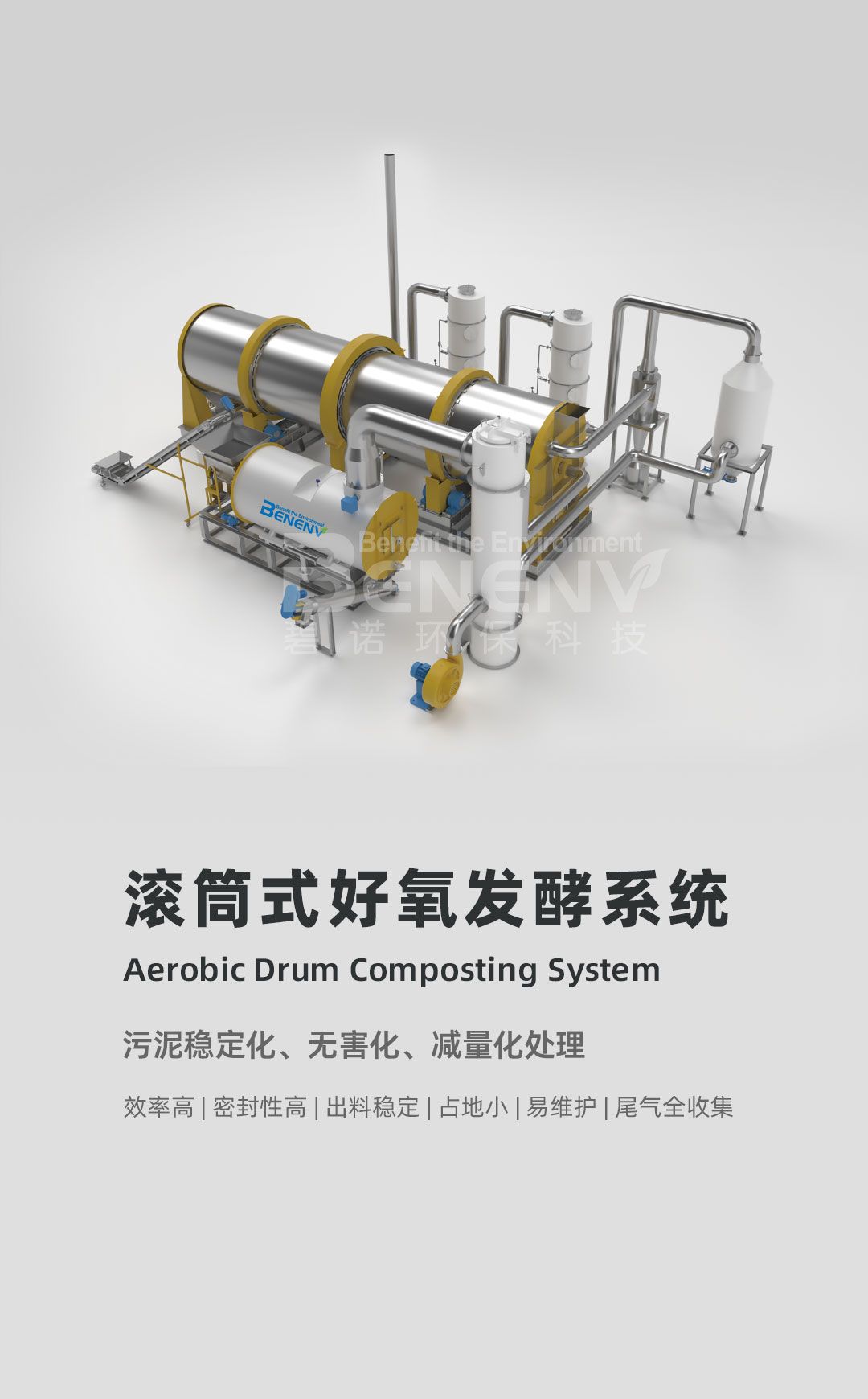 滾筒式好氧發(fā)酵系統(tǒng)是利用全封閉外旋轉(zhuǎn)式滾筒發(fā)酵槽的緩慢轉(zhuǎn)動(dòng),將原料及輔料慢慢移向出料段,并在此過(guò)程中發(fā)生物料的混合和充氧,為微生物提供較優(yōu)越的生長(zhǎng)環(huán)境,快速發(fā)生好氧發(fā)酵反應(yīng)并實(shí)現(xiàn)物料升溫及促進(jìn)有機(jī)物降解。微生物消耗有機(jī)物進(jìn)行代謝時(shí)產(chǎn)生的熱量,使物料維持55-70℃高溫期達(dá)3-5天以上,可有效殺滅病原菌、寄生蟲卵和雜草種籽,并蒸發(fā)水分,使污泥轉(zhuǎn)化成穩(wěn)定的腐殖質(zhì),最終實(shí)現(xiàn)污泥穩(wěn)定化、無(wú)害化、減量化處理,熟化后產(chǎn)品可用于園林綠化、土壤改良等,最終實(shí)現(xiàn)污泥的資源化利用。