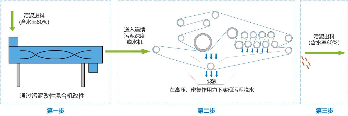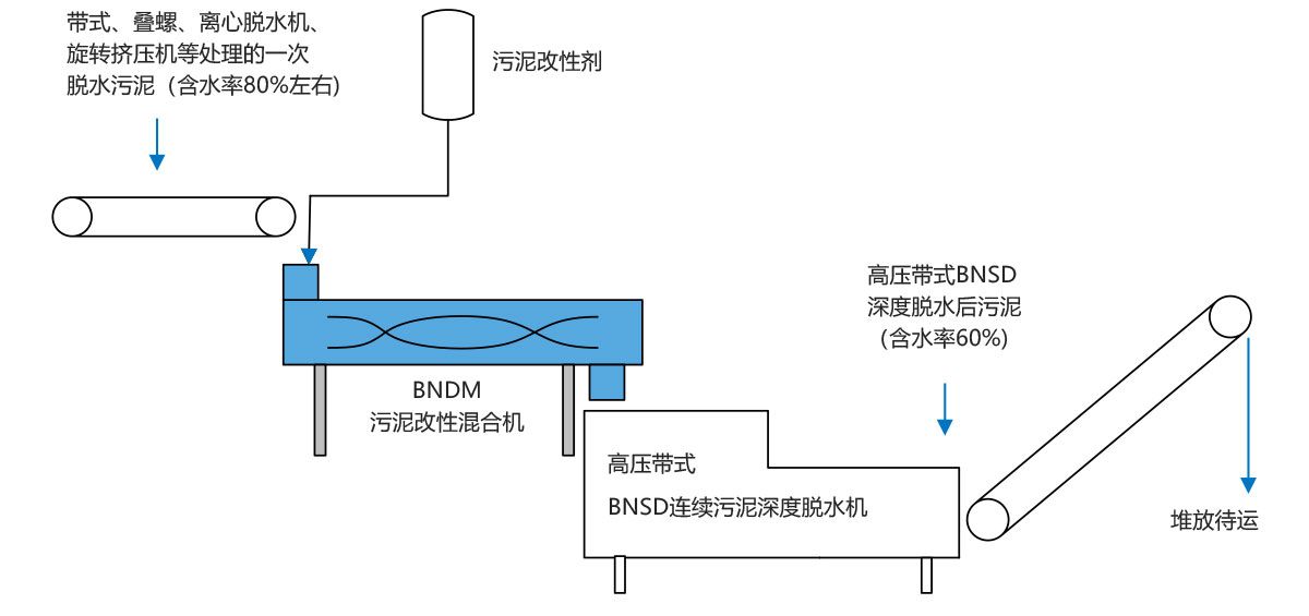 高壓帶式BNSD連續(xù)污泥深度脫水技術(shù)處理一次脫水污泥(含水率為80%左右),在投加污泥改性劑條件下,經(jīng)深度脫水后污泥含水率可降低至60%以下;不但能將污泥深度脫水處理至符合混合填埋的泥質(zhì)要求,也可作為干化、焚燒、水泥窯協(xié)同處置、制磚等處理或處置技術(shù)的的預(yù)處理工藝,以提高污泥整體處理處置工藝路線的經(jīng)濟性。