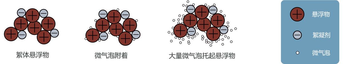 氣浮過(guò)程中形成大量微細(xì)而均勻的氣泡(5~8μm)從而形成氣泡、水、繁體(油)三項(xiàng)混合體,接觸、粘附,形成夾氣絮體上浮到液體表面,通過(guò)機(jī)械刮沫機(jī)撇除浮渣達(dá)到分離雜質(zhì)、凈化水質(zhì)目的。