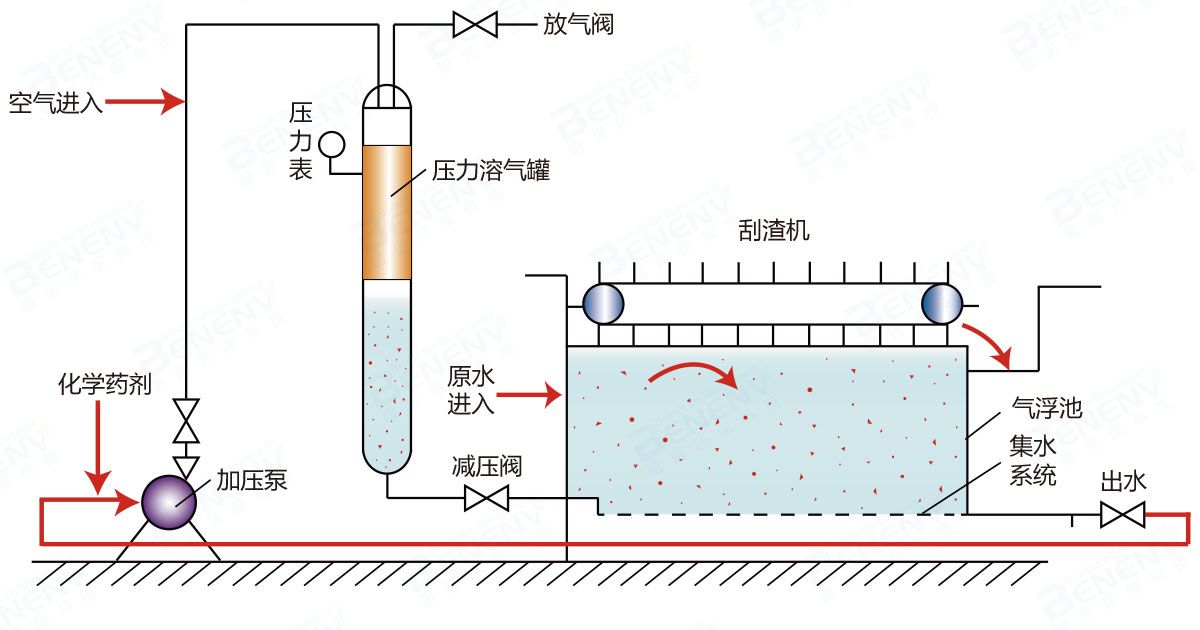 溶氣過(guò)程理論依據(jù)—亨利定律即溶氣氣浮系統(tǒng)中,空氣再高壓下溶于水并接近飽和狀態(tài),在減壓至常壓下釋放,溶解的過(guò)程和空氣以微小氣泡形式從水中析出進(jìn)行氣浮。