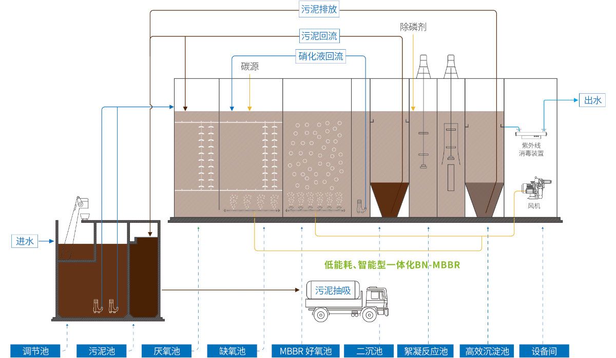 自主開發(fā)的BN-MBBR一體化污水處理設(shè)備主體工藝采用了移動床生物膜反應(yīng)器MovingBedBiofilmReactor,簡稱MBBR)工藝,是MBBR工藝在小規(guī)模集中式污水處理領(lǐng)域的創(chuàng)新應(yīng)用產(chǎn)品,在現(xiàn)有MBBR一體化污水處理設(shè)備的基礎(chǔ)上,進(jìn)行了多項技術(shù)創(chuàng)新并將這些創(chuàng)新技術(shù)進(jìn)行了有機融合和高度集成。