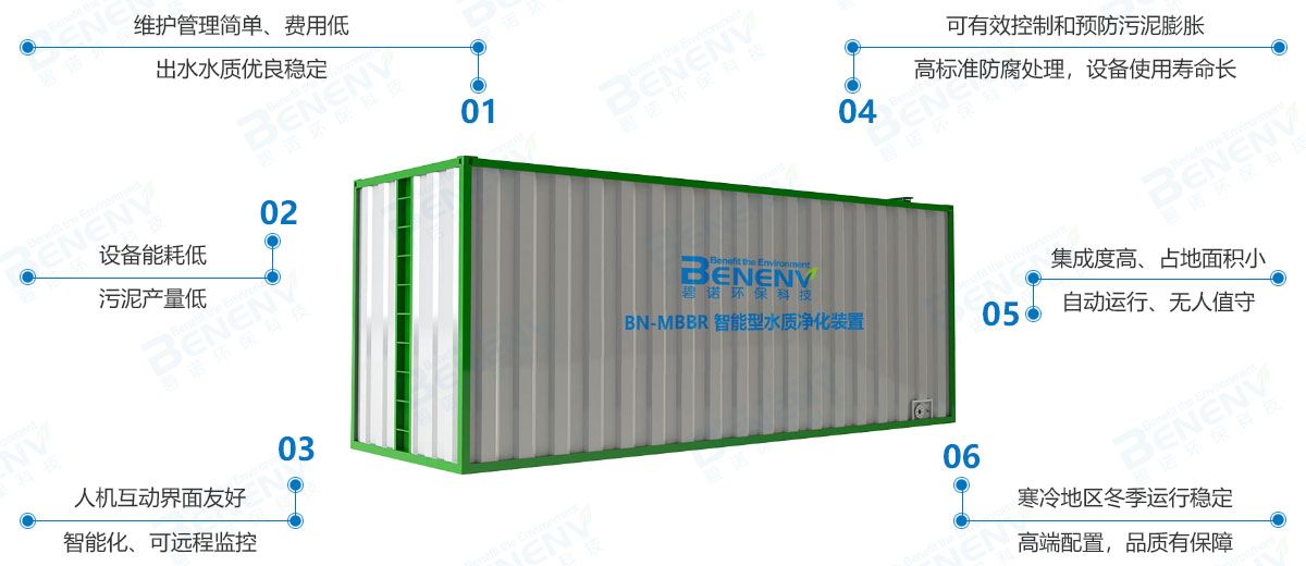 針對目前村鎮(zhèn)生活污水處理存在的痛點、主要處理模式等,自主開發(fā)了“低能耗、智能型一體化MBBR”產(chǎn)品,經(jīng)技術(shù)創(chuàng)新、科學(xué)設(shè)計、精心制造,歷經(jīng)十載,不斷改進(jìn)升級,目前已實現(xiàn)標(biāo)準(zhǔn)化、系列化、規(guī)模化生產(chǎn),產(chǎn)品具有處理高效、運行管理方便等優(yōu)點,而且外觀設(shè)計賞心悅目、美觀大氣,與自然環(huán)境和諧相融,給人以視覺上的享受。