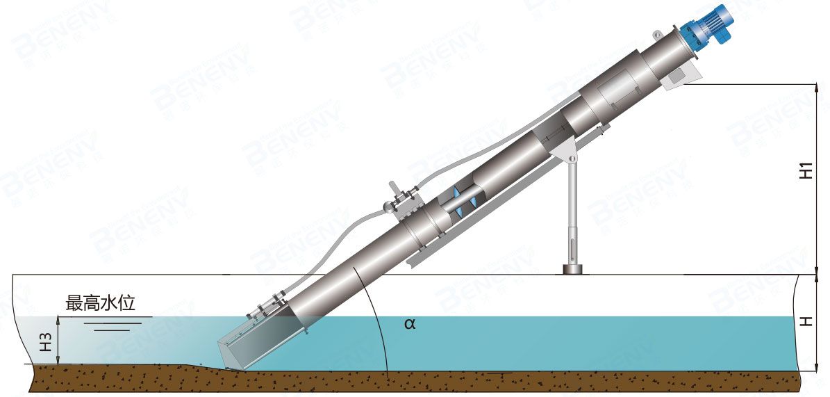 因為篩渣覆蓋,裝置前水位到達控制規(guī)定的柵前液位,此時機械自動啟動工作。篩網清理是通過堅固的不銹鋼螺旋片和耐磨毛刷而實現(xiàn)。同時篩渣在封閉型螺管內被提升輸出。此時提升螺桿在全封閉系統(tǒng)內對篩渣進行運輸,脫水和壓榨處理,然后將篩渣投入集裝箱或者后續(xù)安裝的運輸裝置。