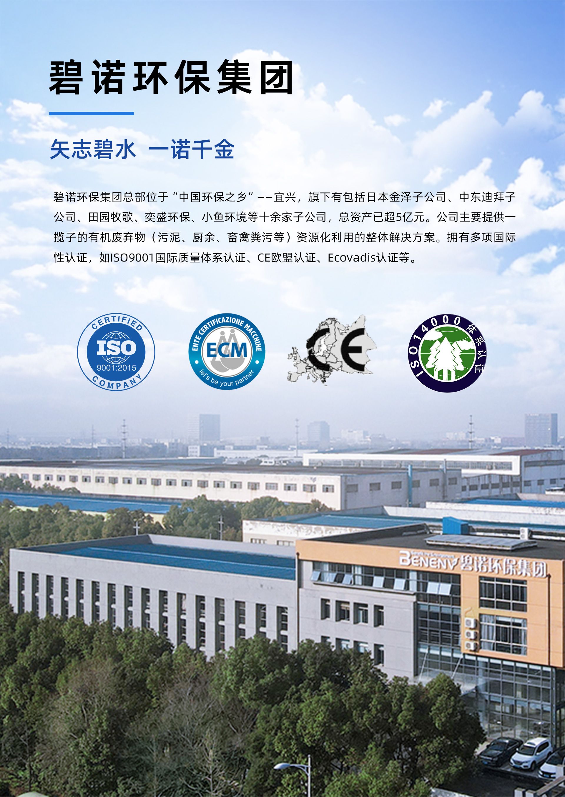 碧諾環(huán)保集團(tuán)總部位于“中國(guó)環(huán)保之鄉(xiāng)”——宜興,旗下有包括日本金澤子公司、中東迪拜子公司、田園牧歌、奕盛環(huán)保、小魚(yú)環(huán)境等十余家子公司,總資產(chǎn)已超5億元。公司主要提供一攬子的有機(jī)廢棄物(污泥、廚余、畜禽糞污等)資源化利用的整體解決方案。擁有多項(xiàng)國(guó)際性認(rèn)證,如ISO9001國(guó)際質(zhì)量體系認(rèn)證、CE歐盟認(rèn)證、Ecovadis認(rèn)證等。