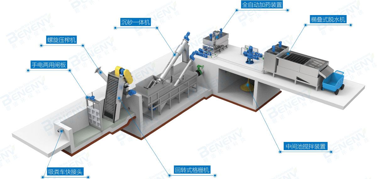 人糞處理解決方案采用碧諾環(huán)保自主研發(fā)的新一代糞便精密過濾系統(tǒng),主要包括預(yù)處理模塊和脫水模塊。預(yù)處理模塊主要由回轉(zhuǎn)式格柵和一體化排渣除砂分離器組成,對糞便進(jìn)行過濾、除砂等機(jī)械性預(yù)處理;脫水模塊采用橢疊式污泥脫水機(jī),對糞漿物質(zhì)進(jìn)行連續(xù)性機(jī)械脫水處理。整套系統(tǒng)結(jié)合物聯(lián)網(wǎng)技術(shù)、傳感器技術(shù),實(shí)現(xiàn)智能控制。